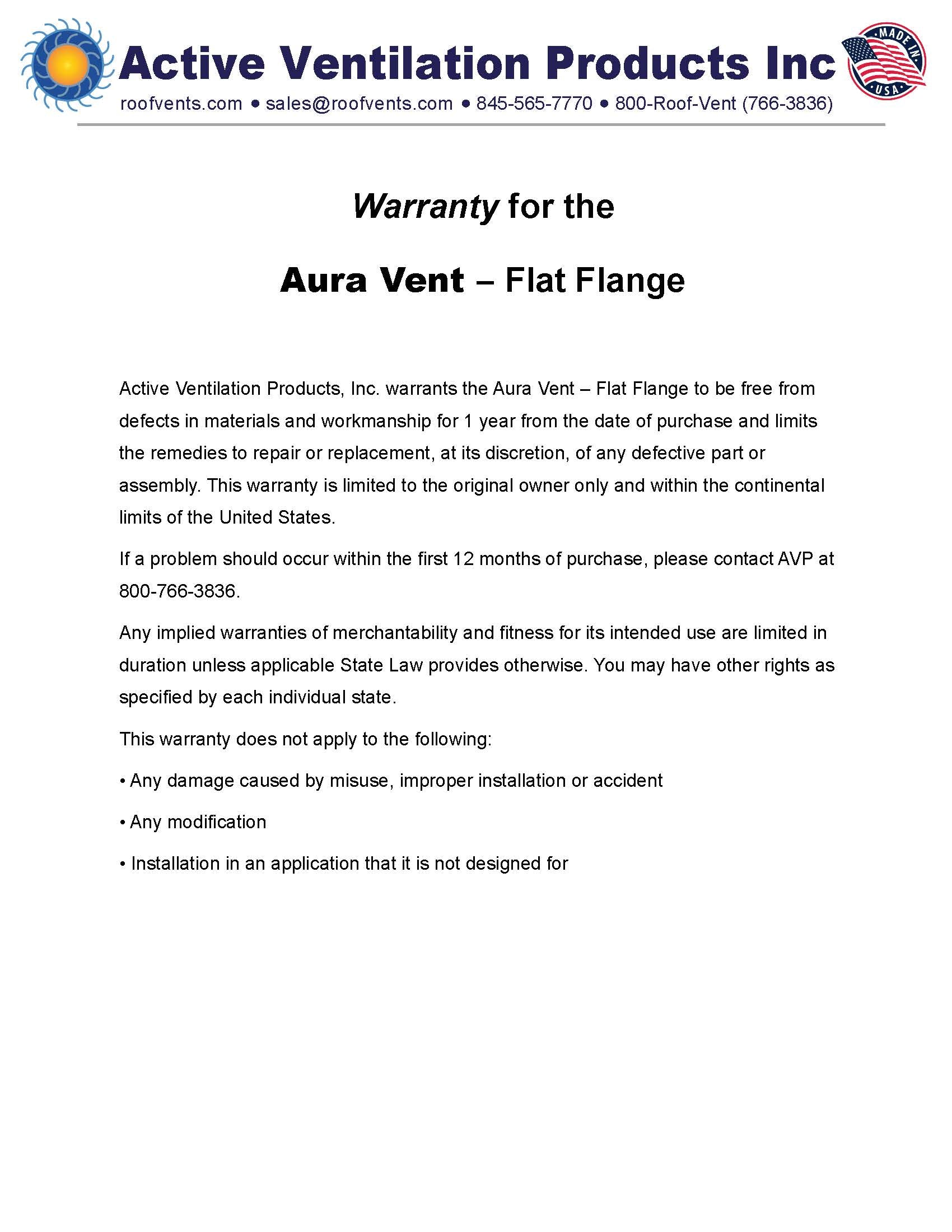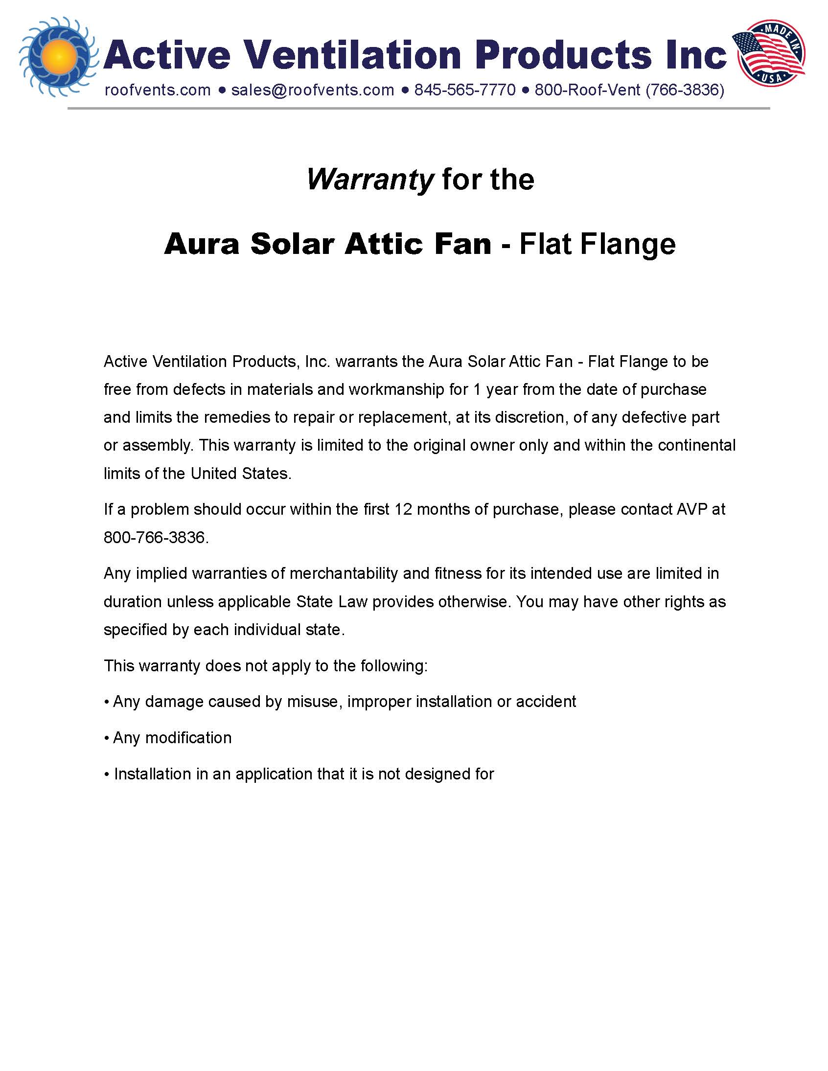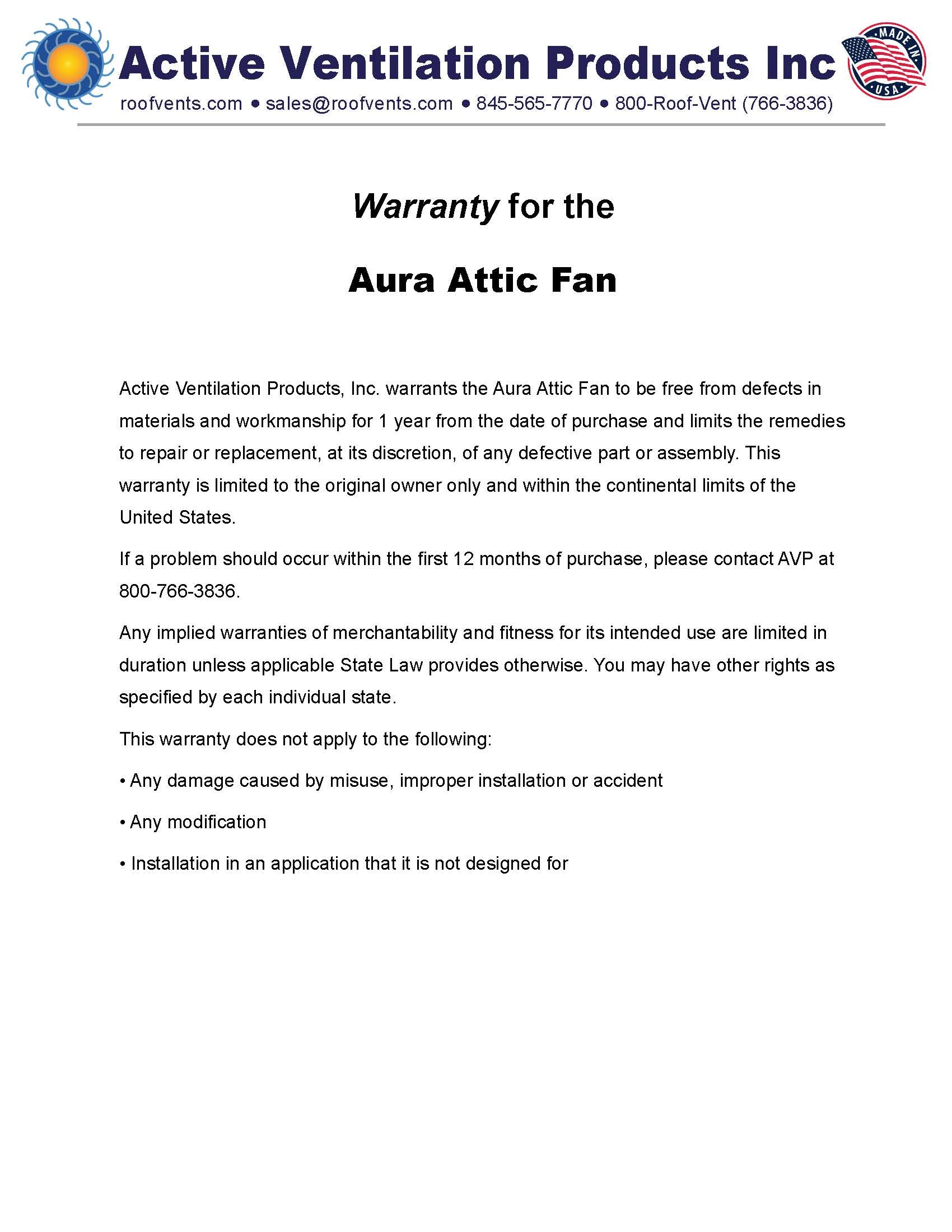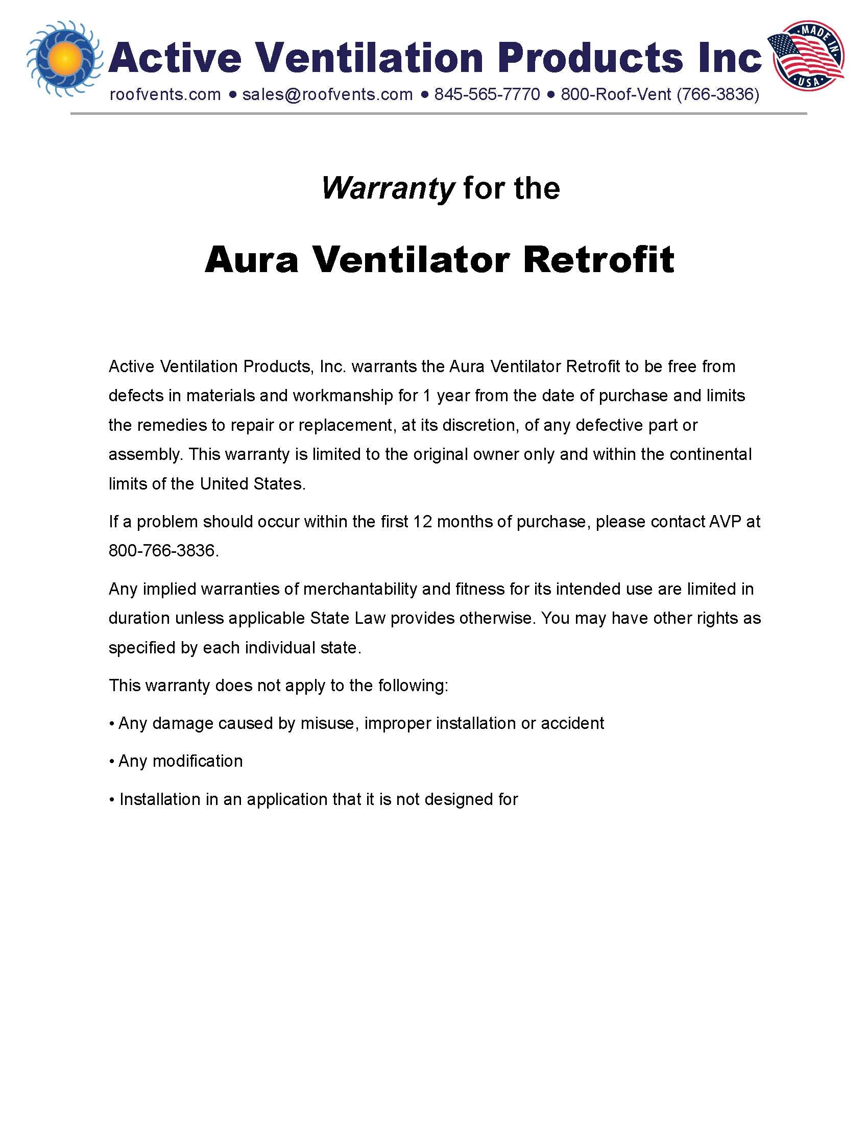 Warranties for Active Ventilation Products, Inc