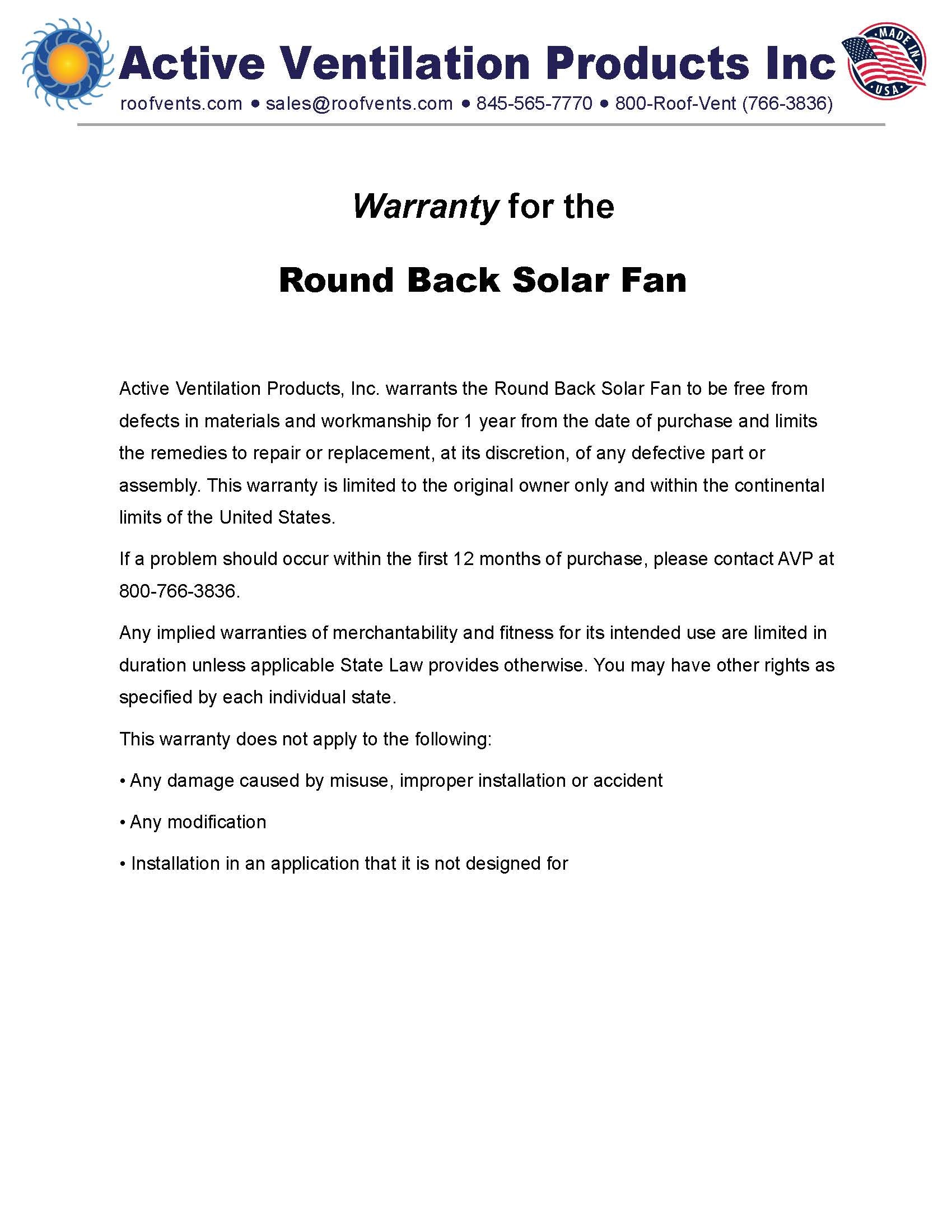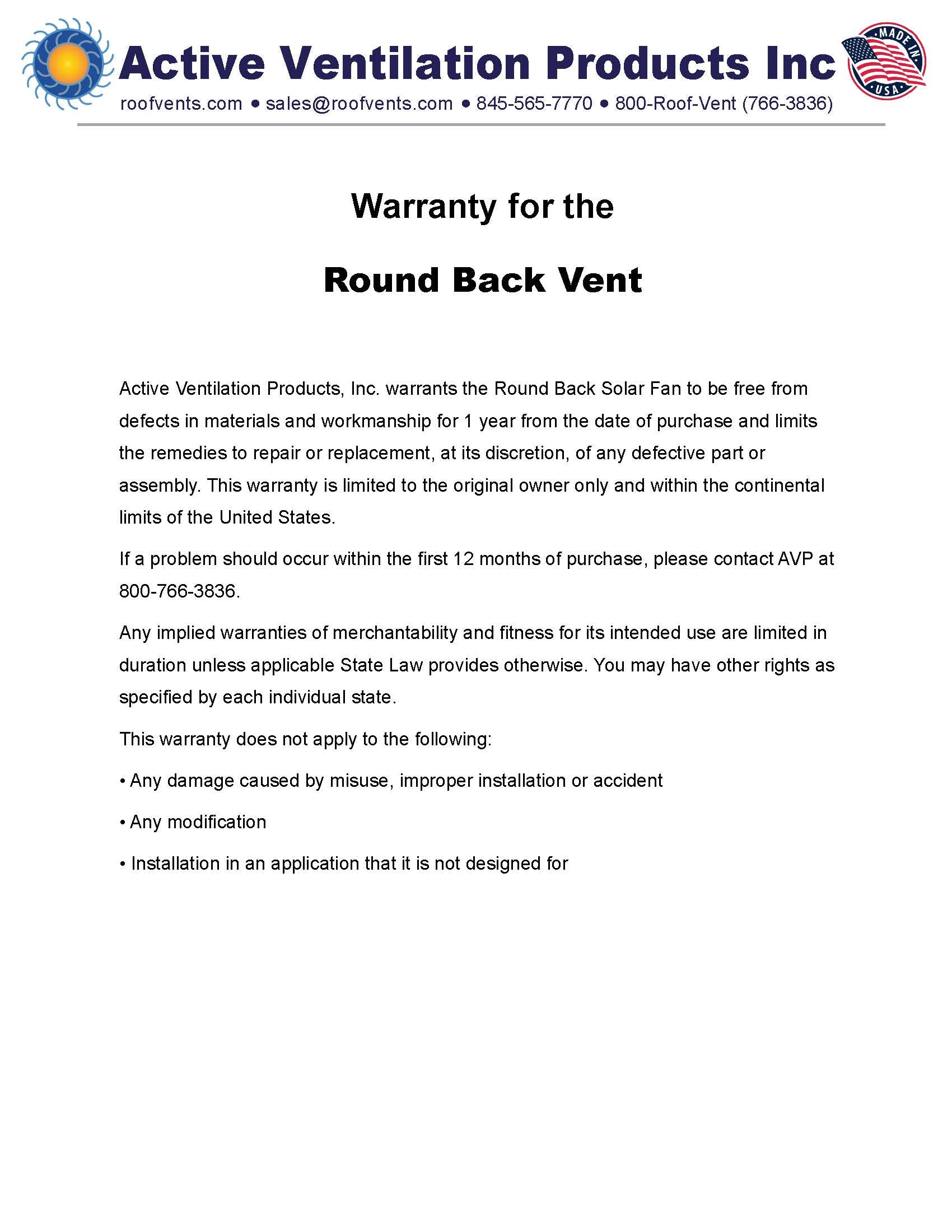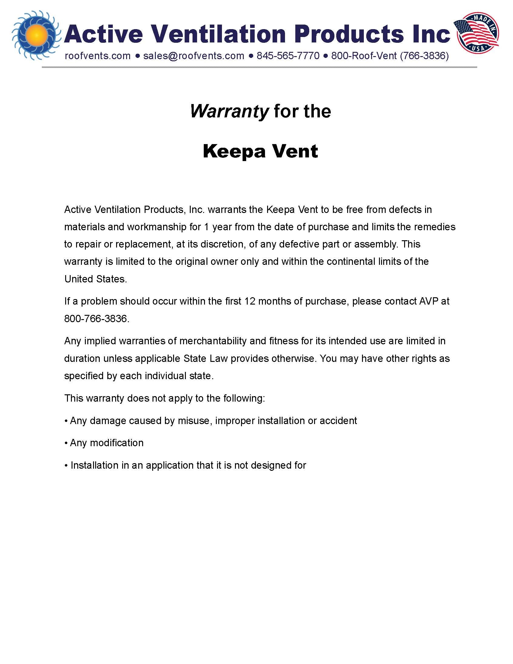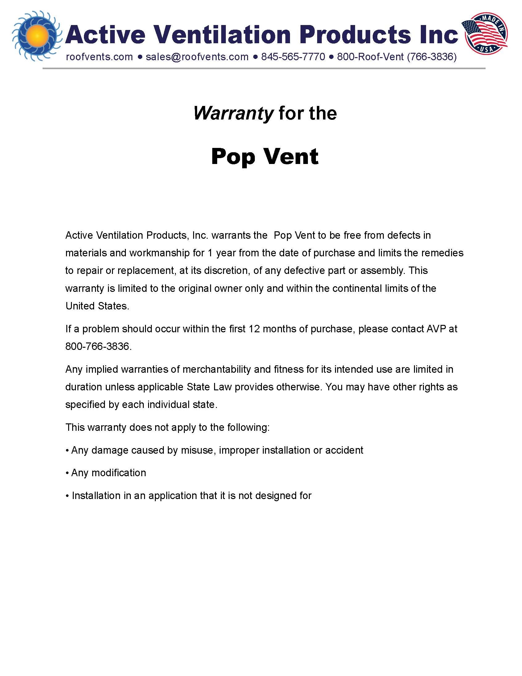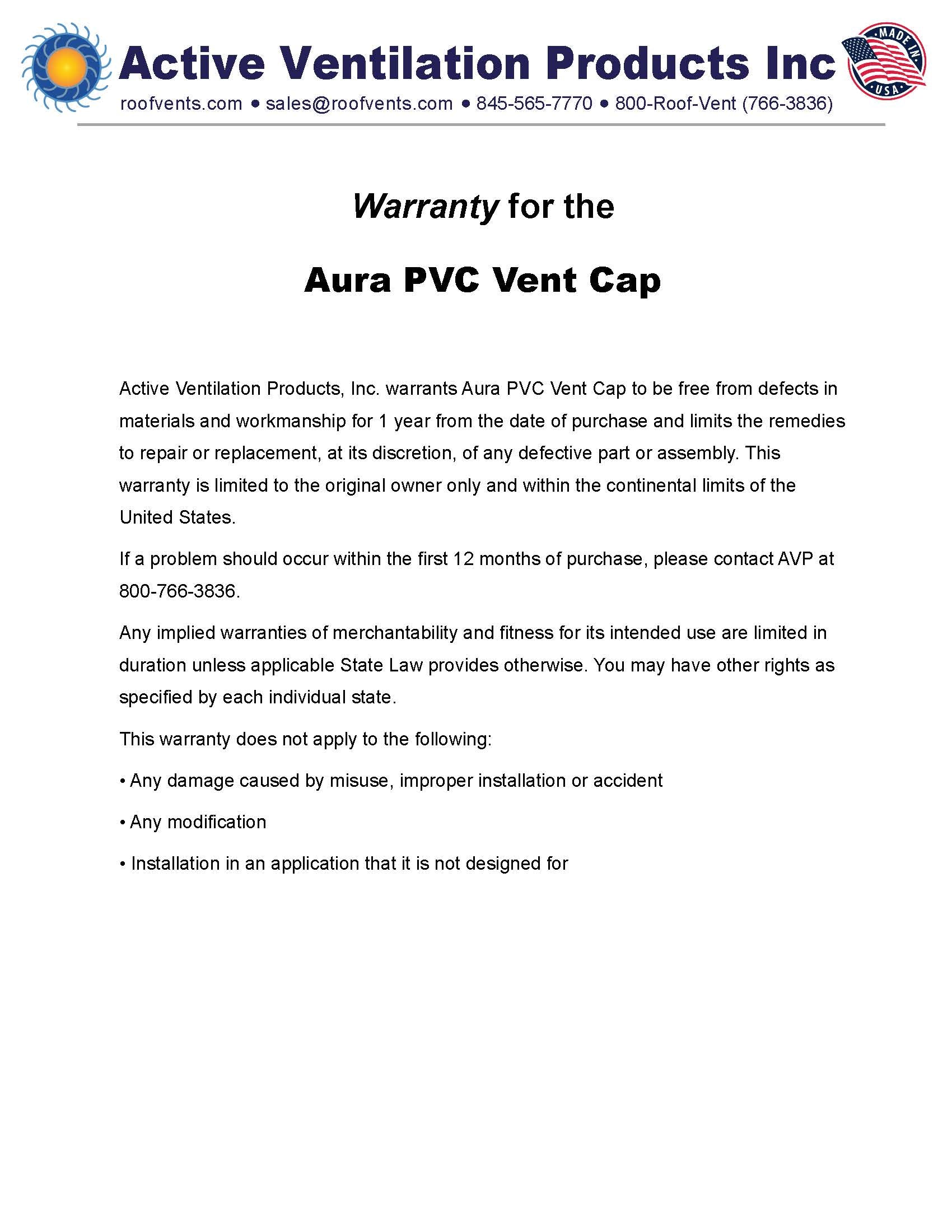 Warranties for Active Ventilation Products, Inc