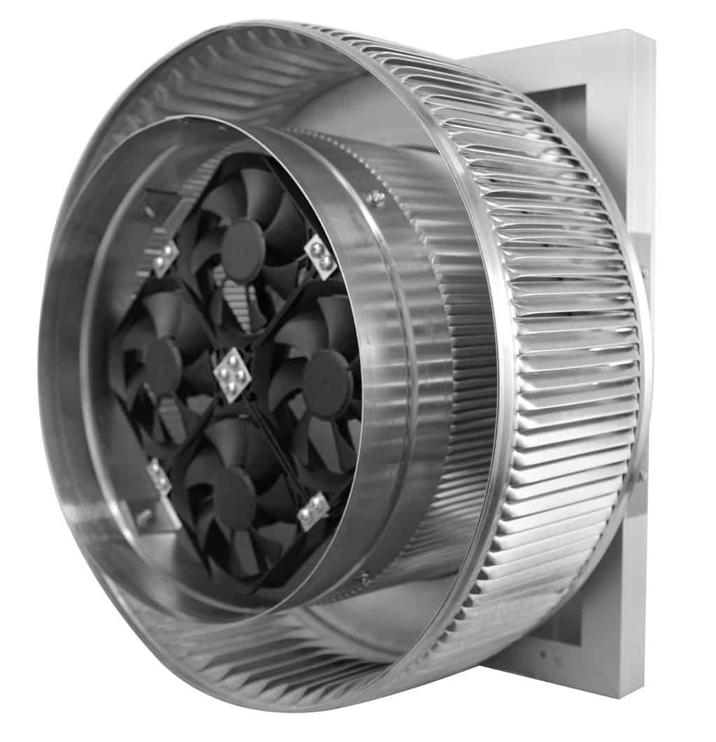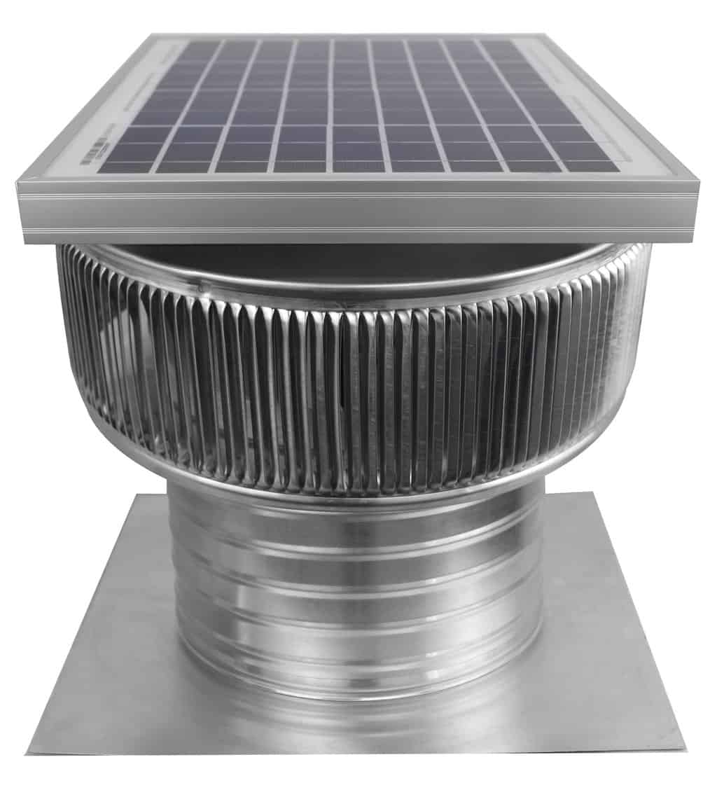 The 10-inch Aura Solar Attic Fan is 10 inches in diameter and has a 6-inch tall collar. The model ASF-10-C6 exhausts air at 524 CFM. All 10-inch solar attic fans have a standard 15" x 15" square flange.