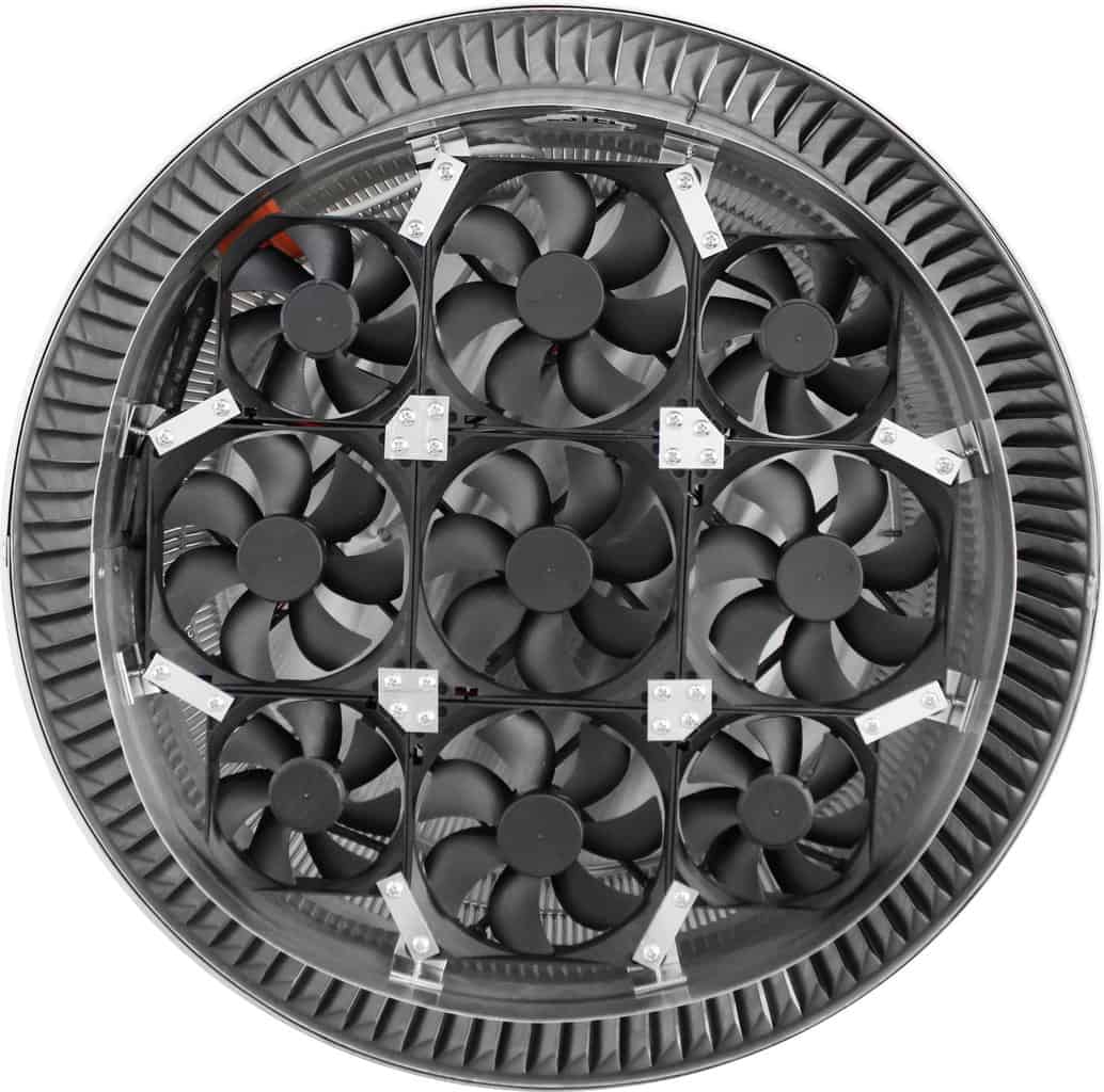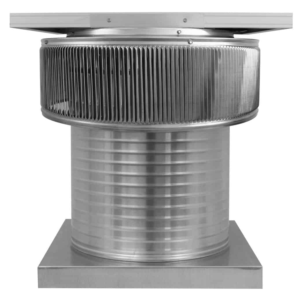 The 16-inch Aura Solar Exhaust Fan is 16 inches in diameter and has a 12-inch tall collar. The model number ASF-16-C12-CMF exhausts air at 1,375 CFM. All 16-inch solar exhaust fans have a standard 20 x 20-inch curb mount flange.