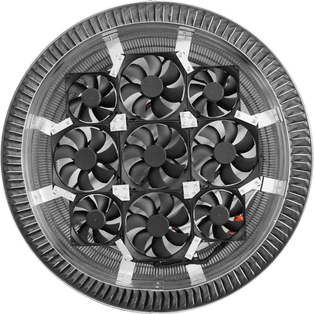 The 18-inch Aura Solar Attic Fan is 18 inches in diameter and has a 12-inch tall collar. The model ASF-18-C12-CMF exhausts air at 1,740 CFM. All 18-inch solar exhaust fans have a standard 22 x 22-inch curb mount flange.
