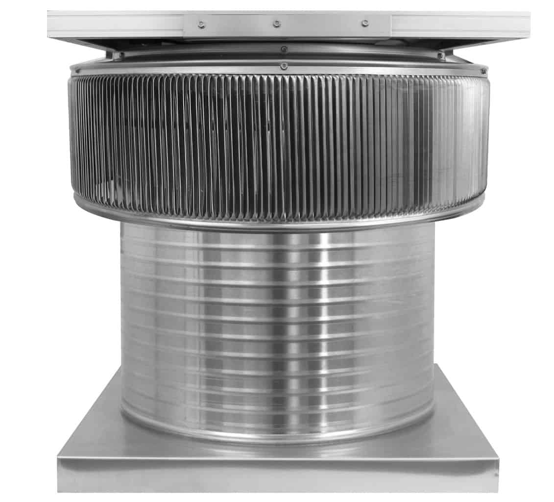 The 20-inch Aura Solar Exhaust Fan is 20 inches in diameter and has a 12-inch tall collar. The model number ASF-20-C12-CMF exhausts air at 2,029 CFM. All 20-inch solar exhaust fans have a standard 24 x 24-inch curb mount flange.