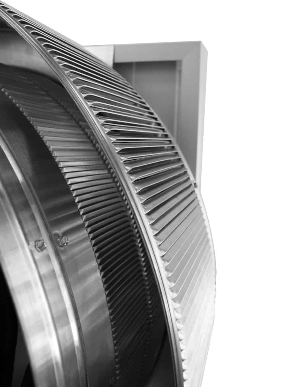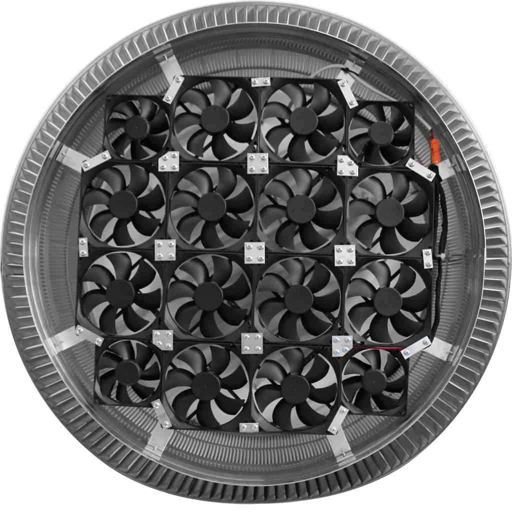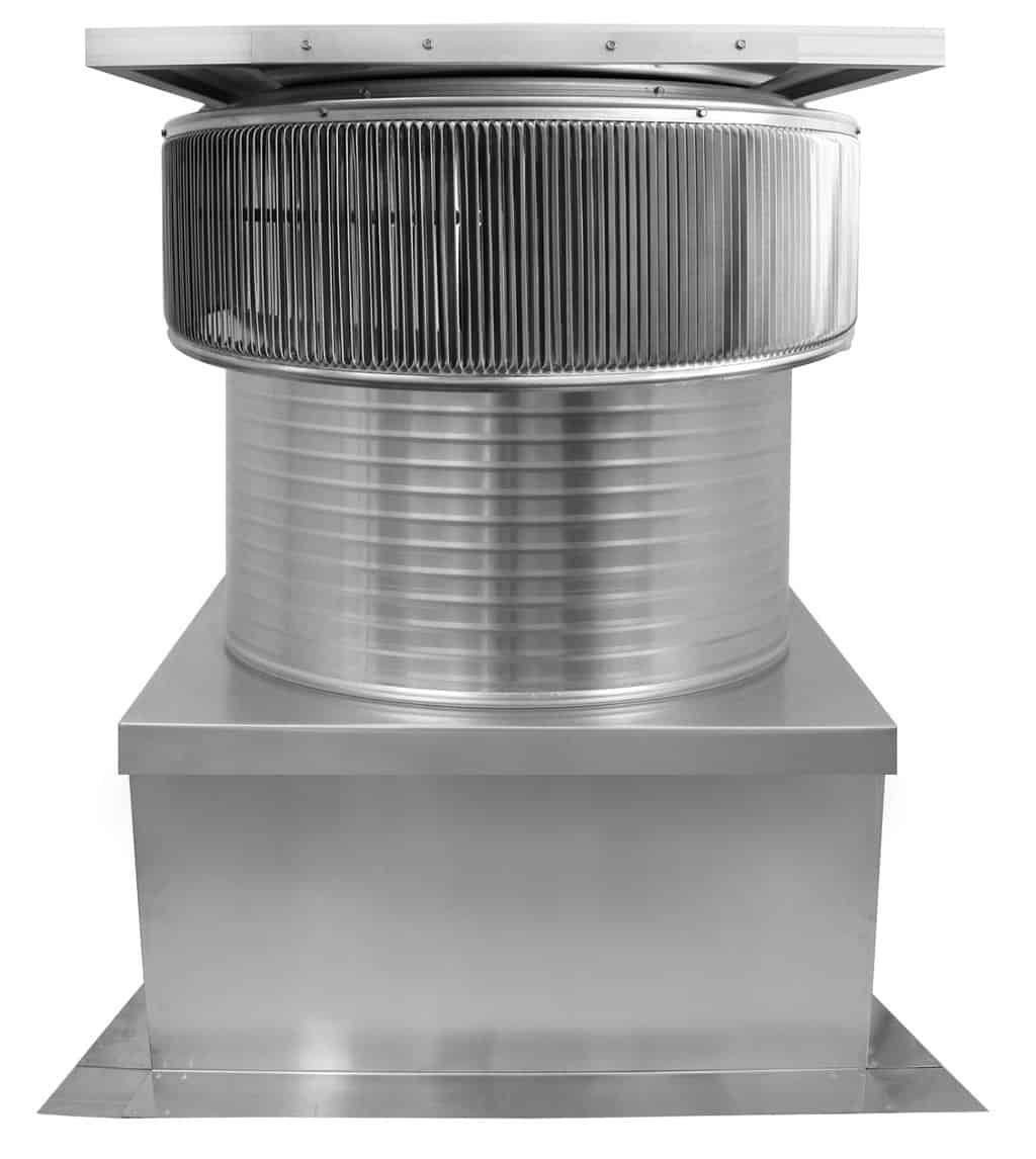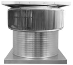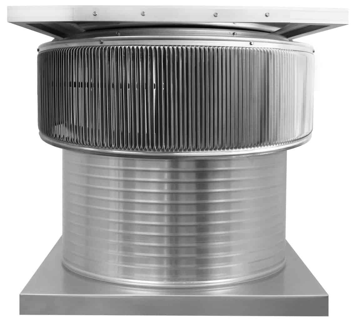 The 24-inch Aura Solar Exhaust Fan is 24 inches in diameter and has a 12-inch tall collar. The model ASF-24-C12-CMF exhausts air at 2,971 CFM. All 24-inch solar exhaust fans have a standard 28 x 28-inch curb mount flange.
