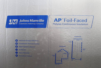 The insulation is Johns Manville R-6, 1-inch thick, foil-faced polyiso board. Polyiso has the highest R-value per inch of any rigid board insulation. This insulation meets both CFC- and HCFC-free specification requirements.