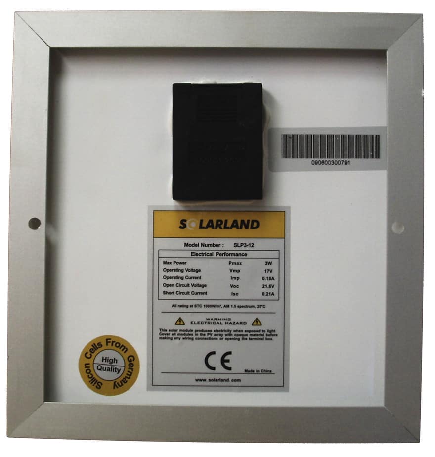 The Solar Panel Model SP-3 features polycrystalline silicon solar cells with a nominal voltage of 12V DC for standard output.
